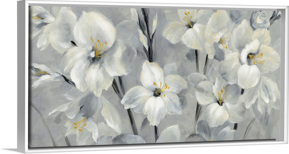 <p>Contemporary painting of white flowers with golden centers on a grey toned background.</p>