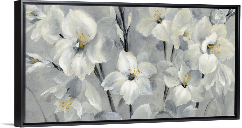 <p>Contemporary painting of white flowers with golden centers on a grey toned background.</p>