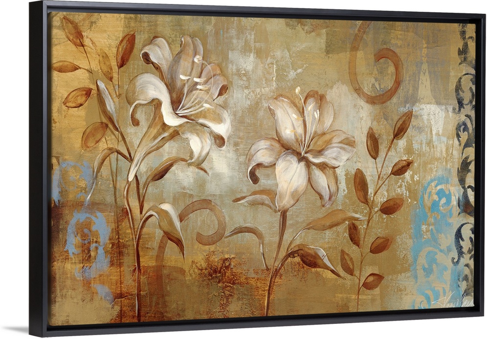 <p>Horizontal wall art of two realistically rendered lilies on a neutral background with decorative vine stencils.</p>