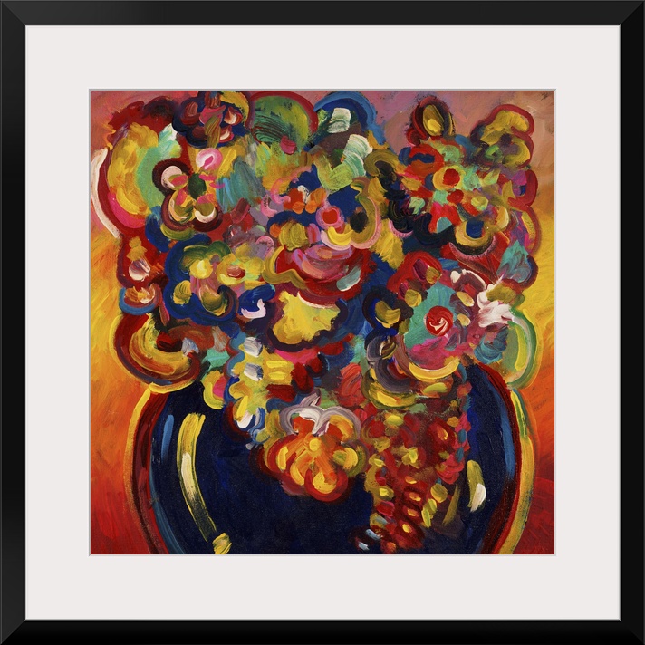 <p>Contemporary painting in vivid rainbow colors of a dark vase full of blooming flowers.</p>