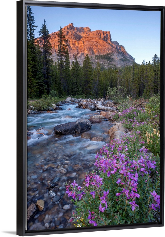 <p>Landscape photograph of a flowing river with wildflowers lining it and mountains in the distance.</p>