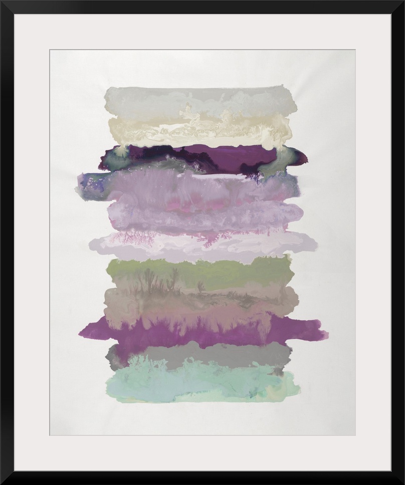 <p>Abstract artwork featuring layered, fluid bands of purple, green, pink, gray, and cream, creating a serene, organic composition with delicate textures and a modern aesthetic.</p>