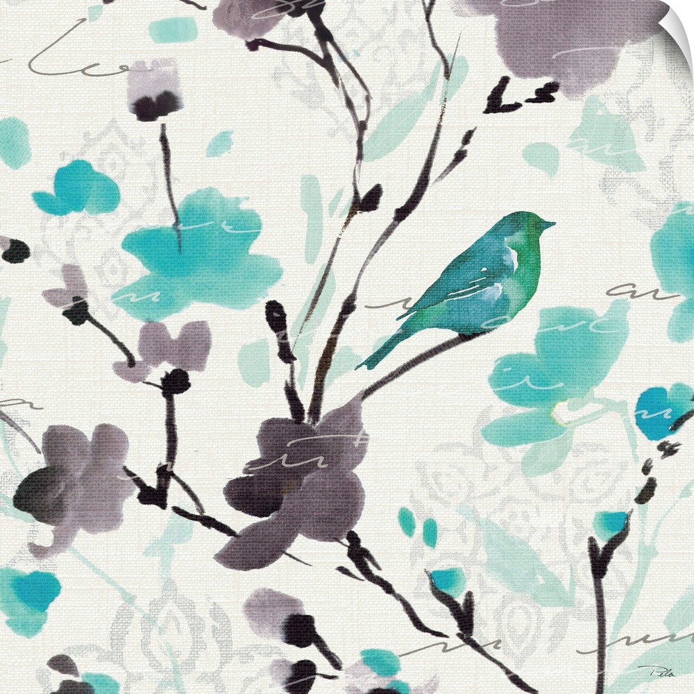 <p>Watercolor painting of a turquoise bird perched on a branch with purple and blue flowers.</p>