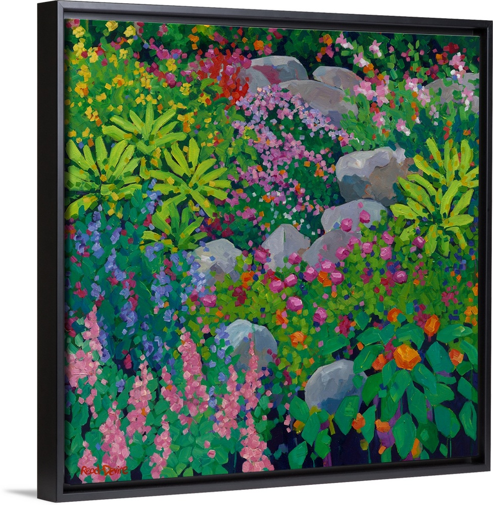 <p>Painting of garden with rocks, ferns, and many colored flowers in bright brushstrokes.</p>