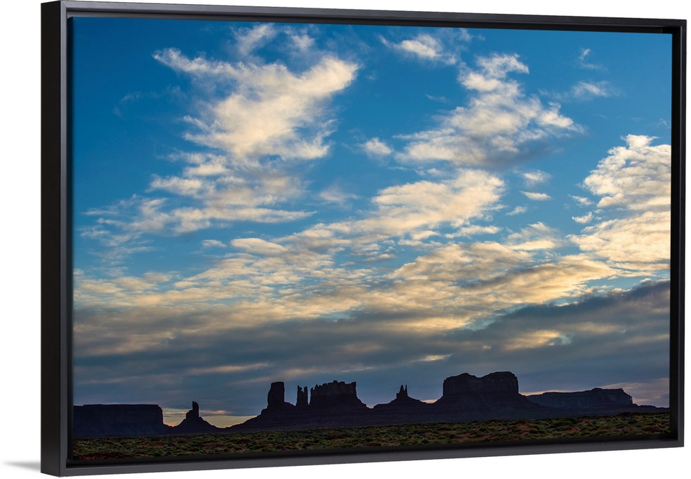 <p>Silhouette of Sentinel Mesa, Big Indian, Stagecoach and Brighams Tomb rock formations, Monument Valley, Utah.</p>