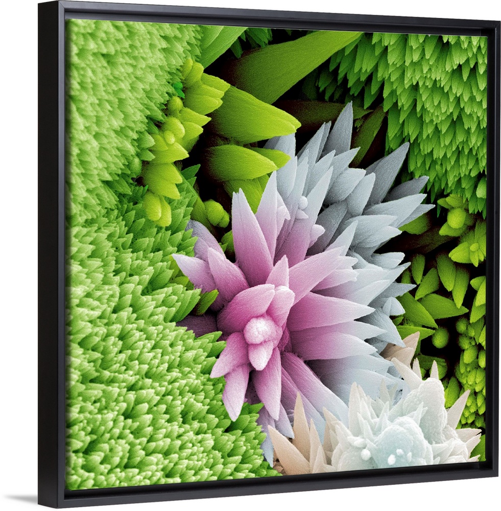 <p>Coloured scanning electron micrograph (SEM) of fluorapatite crystals forming a flower-like structure. Often, as here, apatite takes on the form of needles. Apatite is the main mineral content of human bones and teeth. There's a lot of interest in understanding how apatite formation occurs so that it can be replicated to treat decayed tooth enamel.</p>