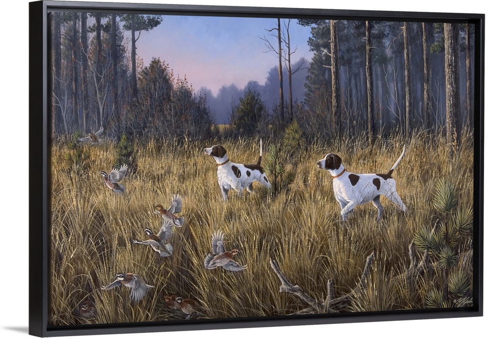 <p>Hunting dogs flushing out game birds.</p>