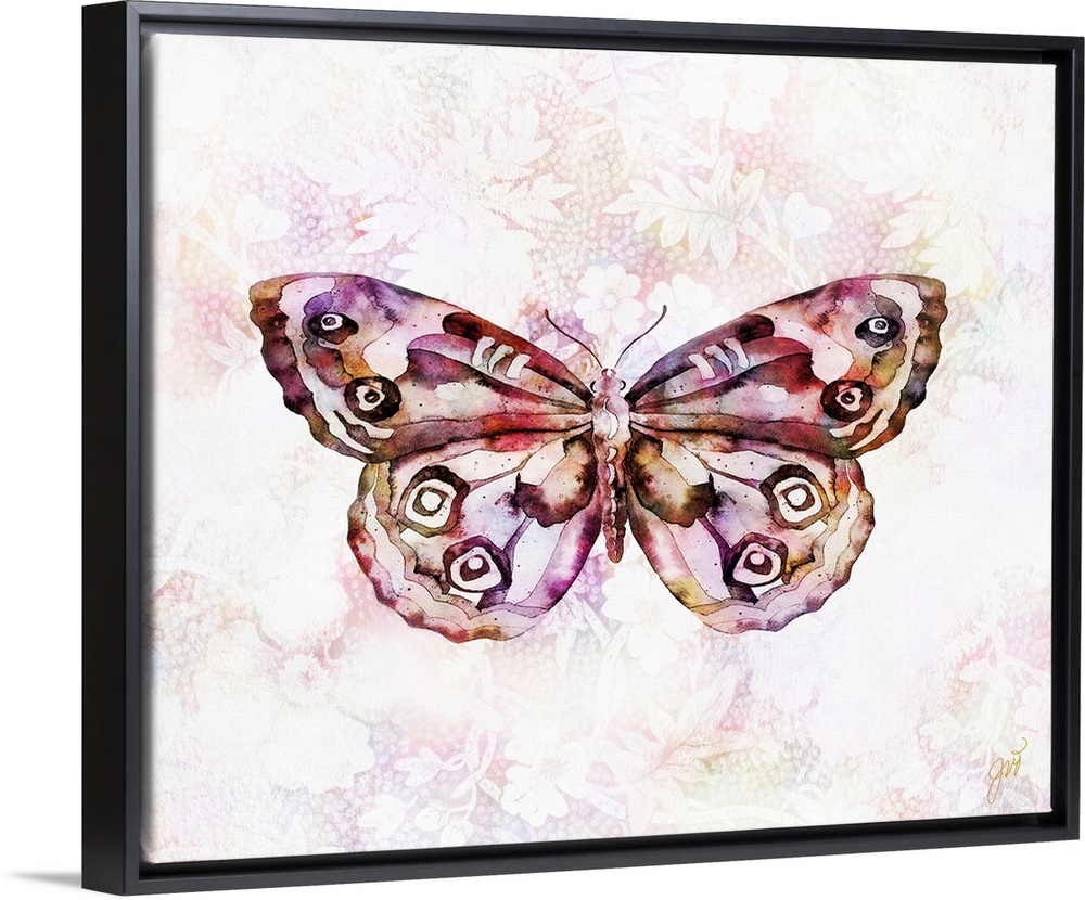 <p>A butterfly rendered in vibrant watercolor over a modern floral background.</p>