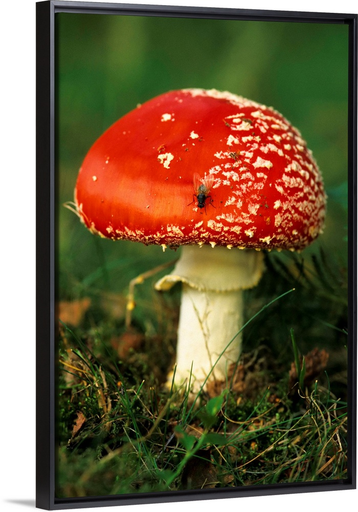 <p>UK. Fly Agaric (Amanita muscaria) mushroom with Fly.</p>