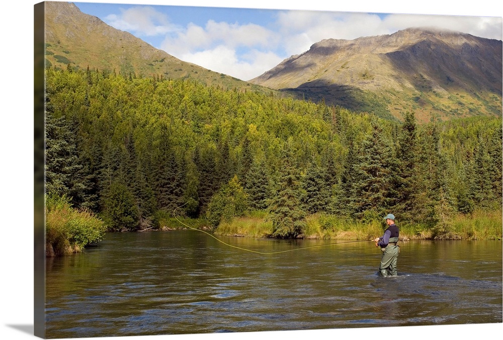 <p>Fly Fisherman Casting for Rainbow Trout or Dolly Varden - Quartz Creek - Kenai Peninsula Alaska - Kenai Mountains</p>
