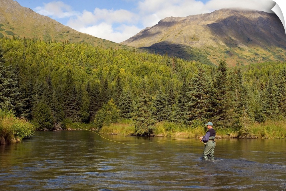 <p>Fly Fisherman Casting for Rainbow Trout or Dolly Varden - Quartz Creek - Kenai Peninsula Alaska - Kenai Mountains</p>