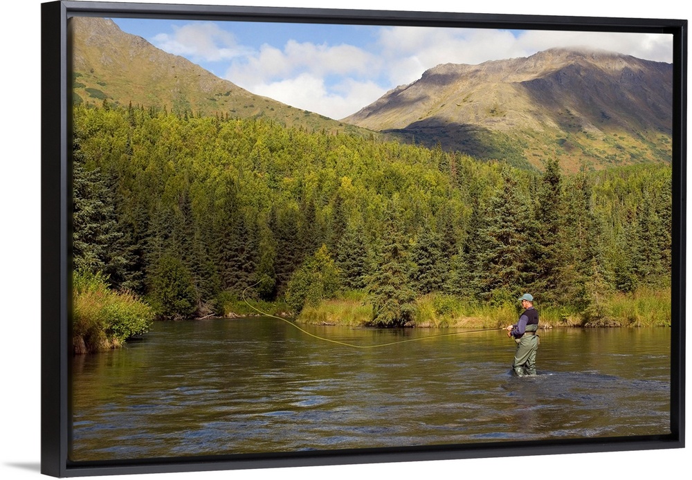 <p>Fly Fisherman Casting for Rainbow Trout or Dolly Varden - Quartz Creek - Kenai Peninsula Alaska - Kenai Mountains</p>