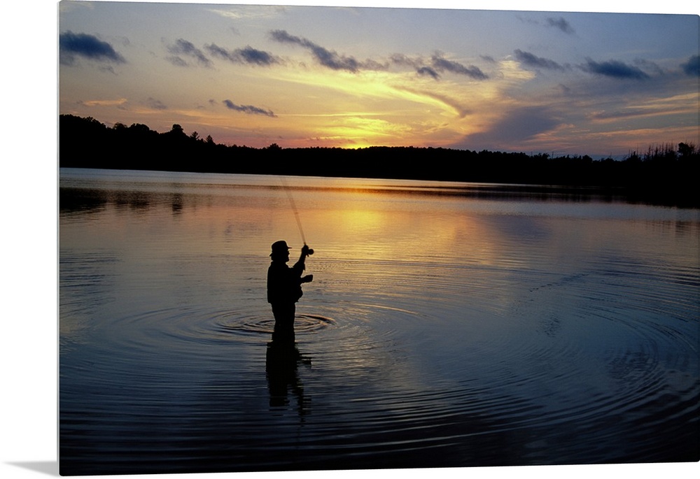 <p>A man waist-deep in water raises his fishing rod before casting it, the ripples flowing away from him and reflecting the light of the rising sun.</p>