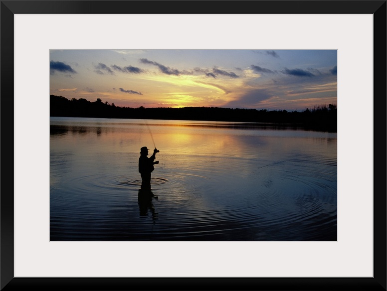 <p>A man waist-deep in water raises his fishing rod before casting it, the ripples flowing away from him and reflecting the light of the rising sun.</p>