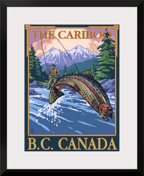 <p>Retro stylized art poster of a fisherman catching a fish in a river. With mountains in the background.</p>