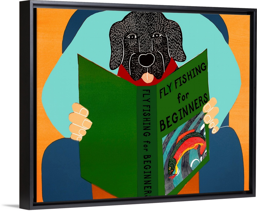 <p>Illustration of a black lab sitting on its owners lap reading a book titled "Fly Fishing For Beginners"</p>