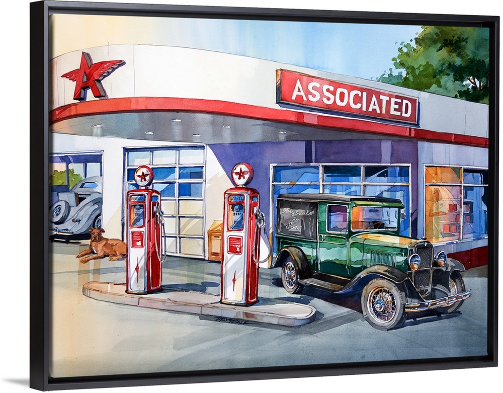 <p>Watercolor painting of a Flying A gas station with a vintage car filling up.</p>