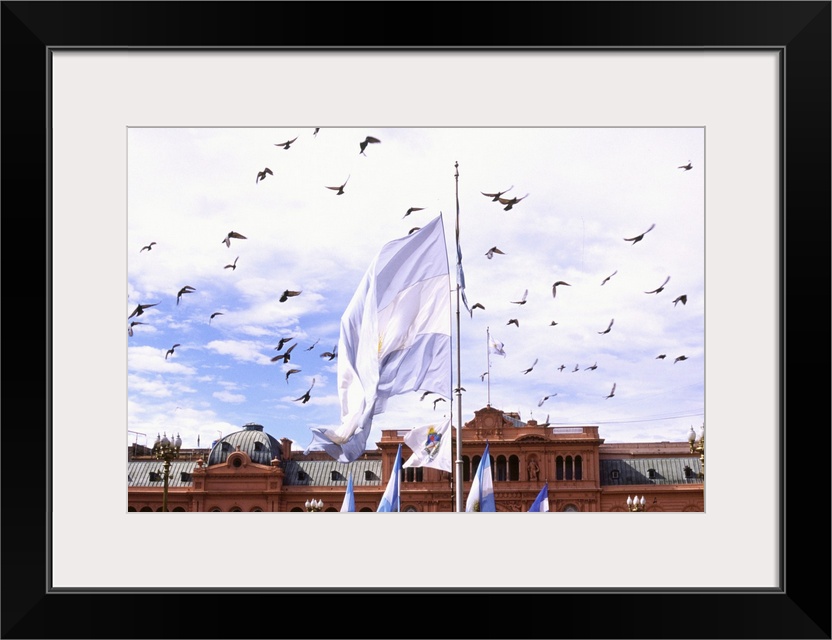 <p>Buenos Aires, Argentina, birds fly above Casa Rosada presidential palace</p>