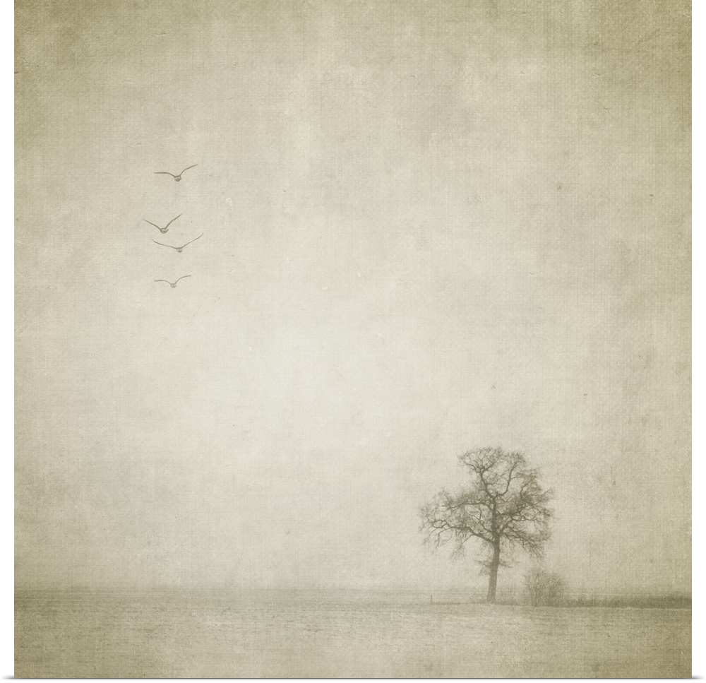 <p>A lonely tree and four birds flying away in an empty and strange landscape</p>