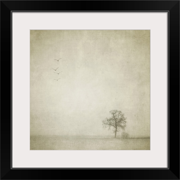 <p>A lonely tree and four birds flying away in an empty and strange landscape</p>