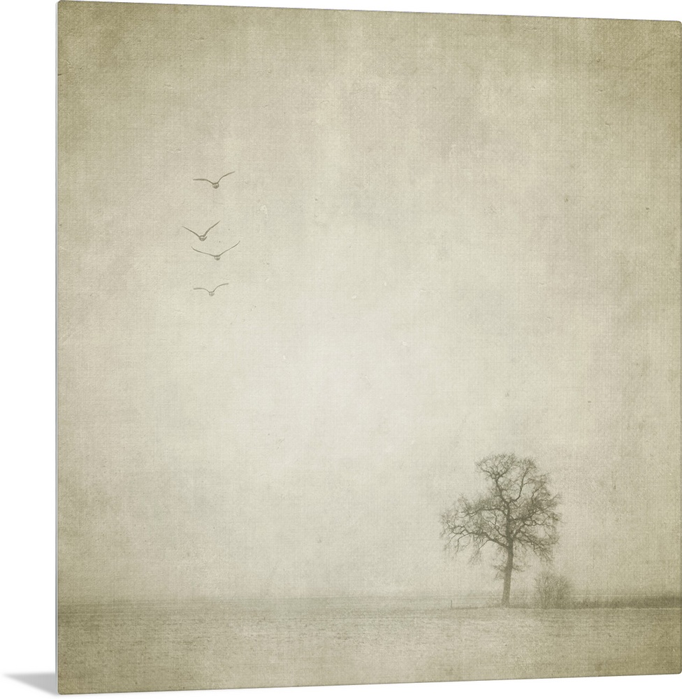 <p>A lonely tree and four birds flying away in an empty and strange landscape</p>
