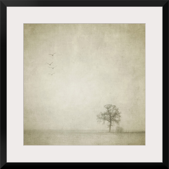 <p>A lonely tree and four birds flying away in an empty and strange landscape</p>