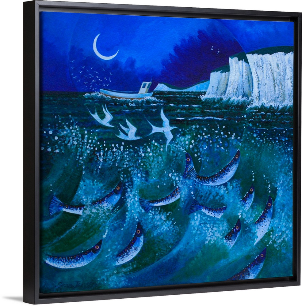<p>Contemporary painting of fish leaping out of the ocean near sea cliffs at night.</p>