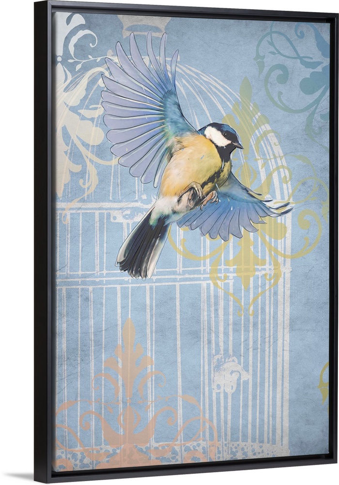 <p>A Blue Tit in flight over a pastel image of a cage and vintage flourishes.</p>