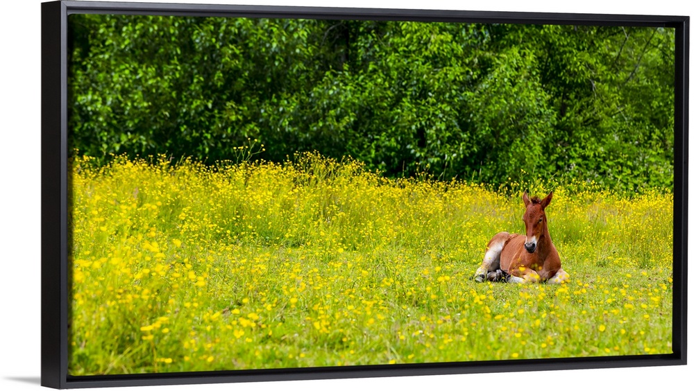 <p>Foal lying down in a pasture; Saskatchewan, Canada</p>