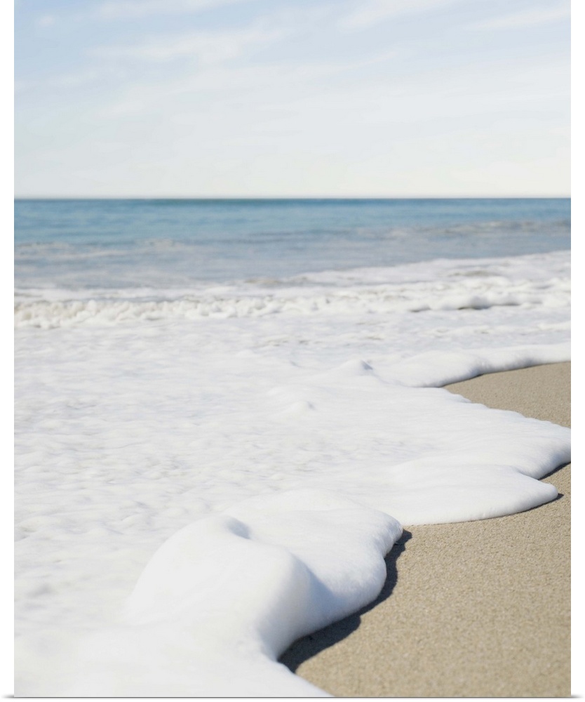 <p>Foam from a wave washing up on beach on a sunny day.</p>