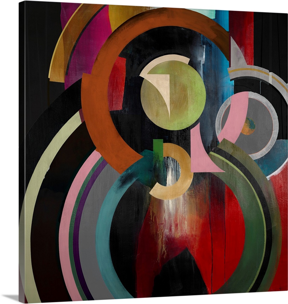 <p>Vibrant abstract artwork featuring overlapping geometric arcs and circles in a rich palette of orange, green, pink, and blue against a textured dark background, creating a dynamic, modern aesthetic.</p>