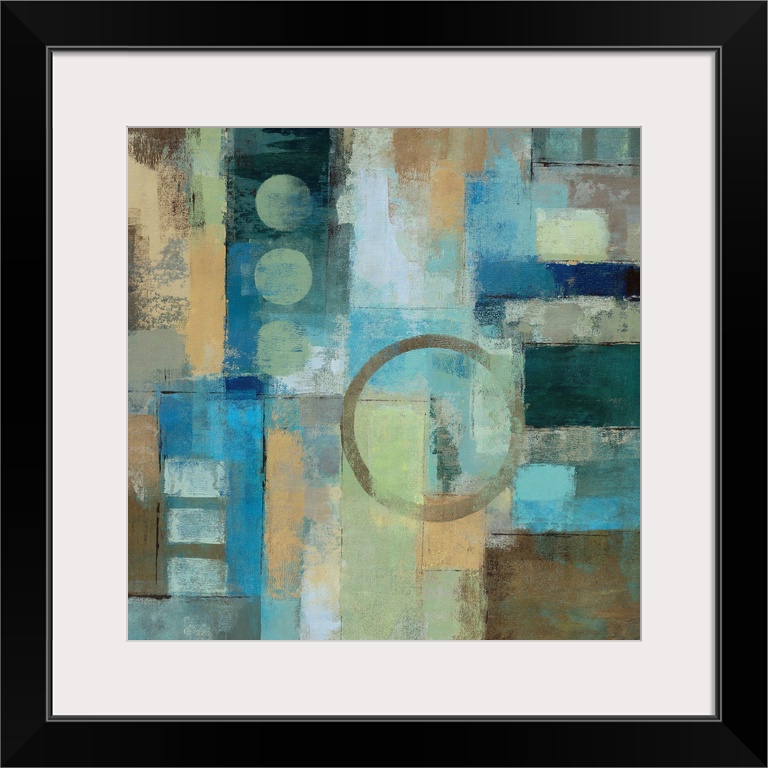 <p>Abstract artwork that uses blocks of colors in different directions with splotches of paint over the entire piece.</p>