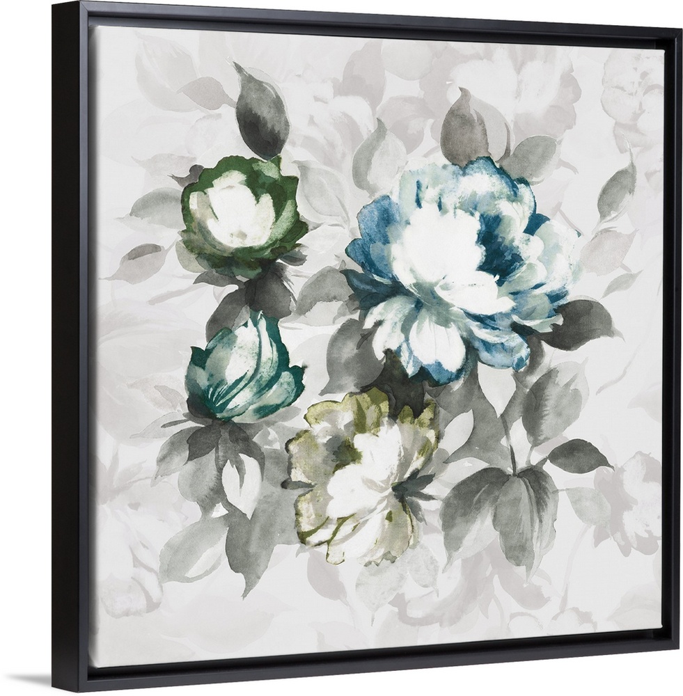 <p>A large contemporary painting of a full bloomed flowers in green, teal and blue against of grey backdrop.</p>