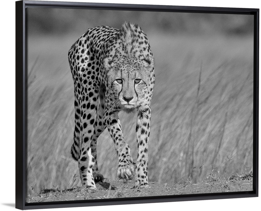 <p>A black and white portrait of a cheetah walking with a stalking intent.</p>
