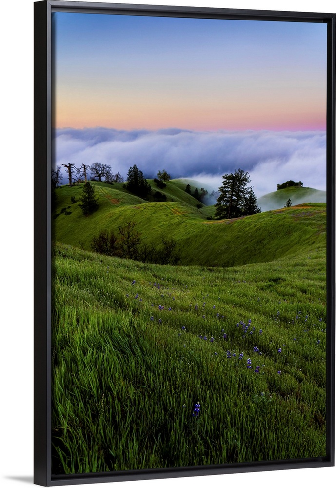 <p>Fog banks rolling in off of the ocean with the sun setting below them, lush meadow on the rolling hills in the foreground, Big Sur, California, United States of America</p>