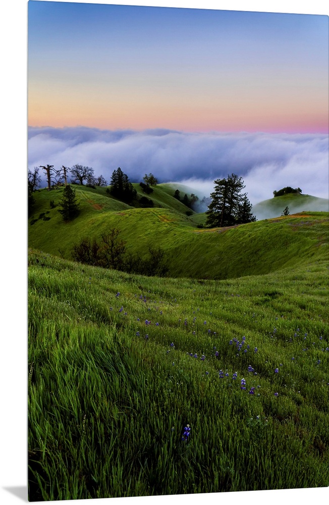 <p>Fog banks rolling in off of the ocean with the sun setting below them, lush meadow on the rolling hills in the foreground, Big Sur, California, United States of America</p>