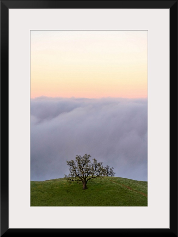 <p>Fog banks rolling in off of the ocean with the sun setting below them, a lone tree stands on grass in the foreground, Big Sur, California, United States of America</p>