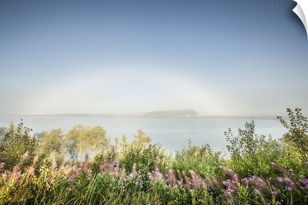 <p>Fog bow over Lake Superior's north shores with wildflowers in the foreground; Nipigon, Ontario, Canada</p>