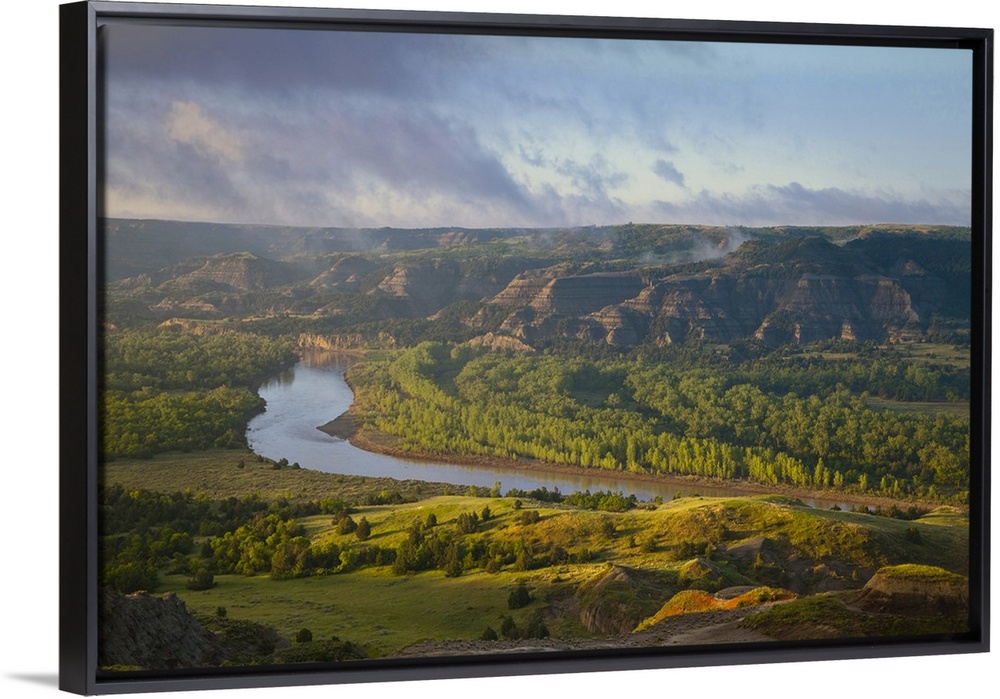 <p>Fog burns off at sunrise from River Bend Overlook in the North Unit of Theodore Roosevelt National Park, North Dakota, USA</p>