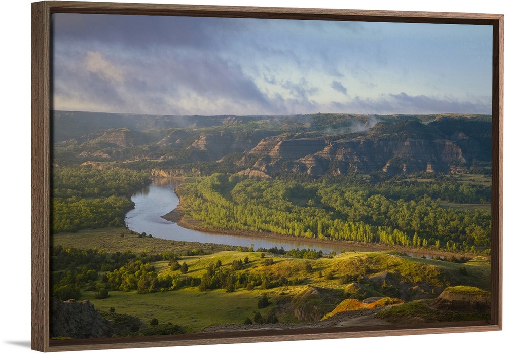 <p>Fog burns off at sunrise from River Bend Overlook in the North Unit of Theodore Roosevelt National Park, North Dakota, USA</p>