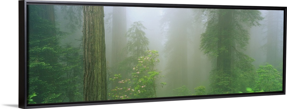 <p>A big panoramic piece of a forest with different types of trees shown and a layer of fog in the distance.</p>