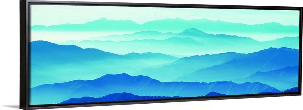 <p>Giant monochromatic photograph shows a considerable amount of mist rolling over the many layers of a mountain range.</p>