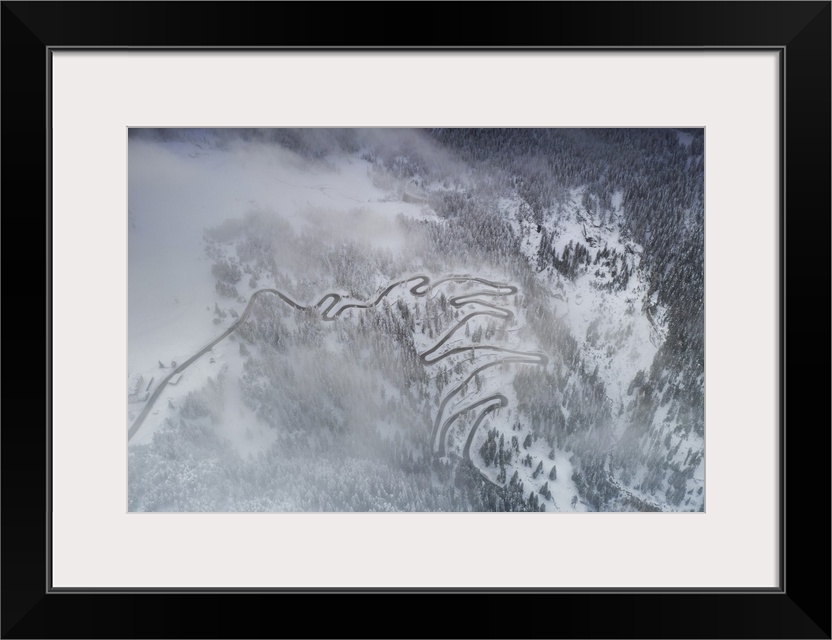 <p>Fog on bends of Maloja Pass road and snowy woods, aerial view, Bregaglia Valley, Engadine, canton of Graubunden, Switzerland, Europe</p>