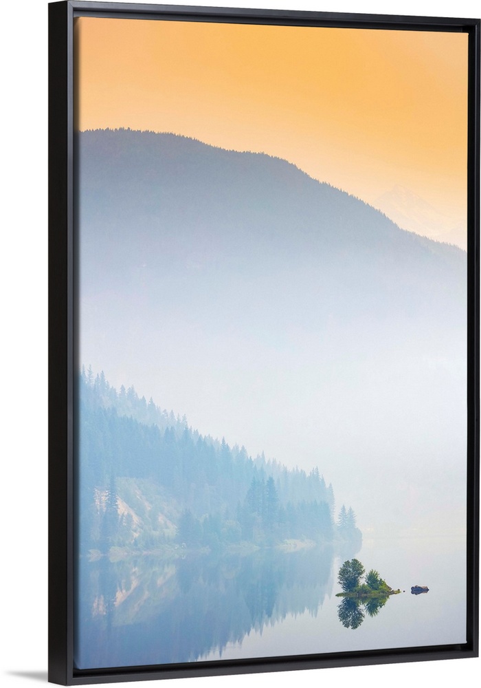 <p>Dense fog over a lake and mountain with a glowing orange sky at sunrise; British Columbia, Canada</p>