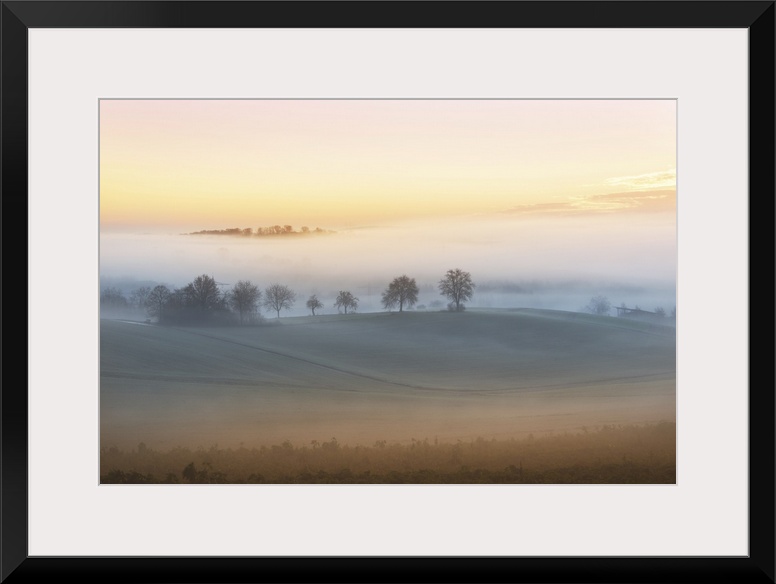 <p>Layers of thick fog wafting across the rolling hills of Kraichgau region shortly after sunrise, Baden-Wurttemberg, Germany, Europe</p>