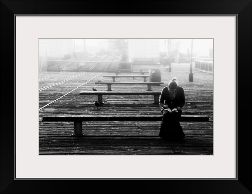 <p>A woman reading on a bench on a pier with seagulls in the mist.</p>