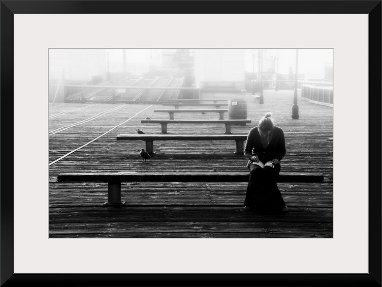 <p>A woman reading on a bench on a pier with seagulls in the mist.</p>