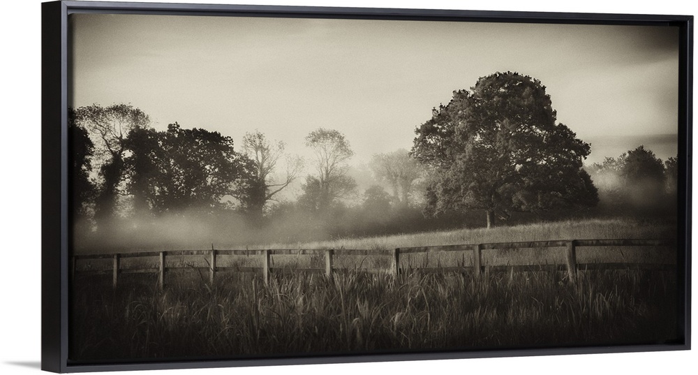 <p>A horizontal photograph of a country field with a wooden fence and mist over trees in the distance.</p>
