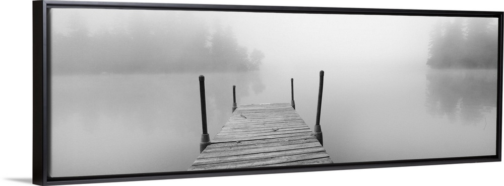 <p>A black and white photograph of a dock stretching out over a foggy lake in an idyllic setting.</p>