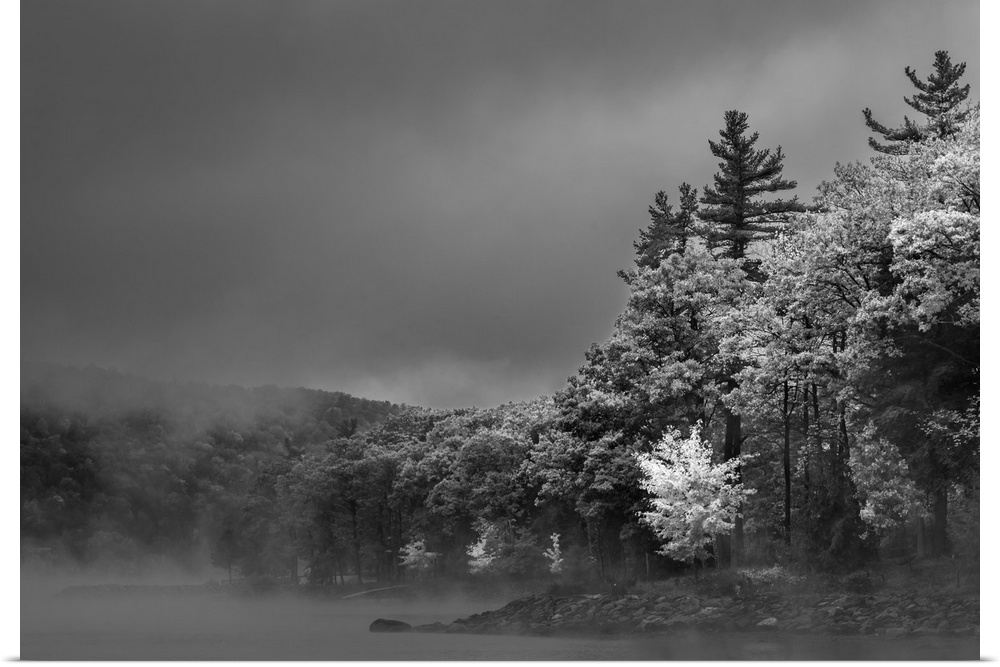 <p>Black and White image of heavy fog over a lake lined with trees on a gloomy day.</p>
